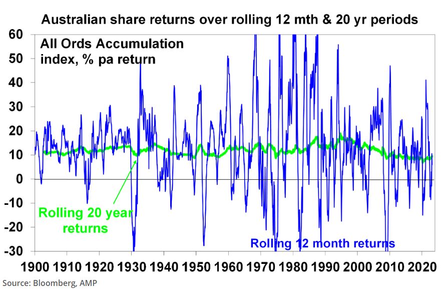 The trouble is that shares can have lots of (often severe) setbacks along the way as is evident during the periods highlighted by the arrows on the previous chart. Even annual returns in the share market are highly volatile but longer term returns tend to be solid and relatively smooth, as can be seen in the next chart. Since 1900, for Australian shares roughly two years out of ten have had negative returns but there are no negative returns over rolling 20-year periods.