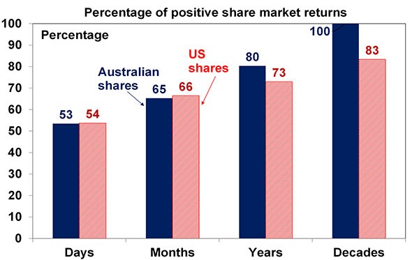 On a day to day basis it’s around 50/50 as to whether shares will be up or down, but since 1900, shares in the US have had positive returns around seven years out of ten and in Australia it’s around eight years out of ten.