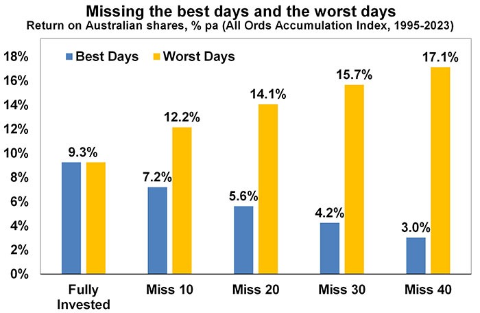 Finally, even when it might pay to be pessimistic and hence out of the market in corrections and bear markets, trying to get the timing right can be very hard. In hindsight many downswings in markets like the GFC look inevitable and hence forecastable, and so it’s natural to think you can anticipate downswings going forward. But trying to time the market – in terms of both getting out ahead of the fall and back in for the recovery – is difficult. A good way to demonstrate this is with a comparison of returns if an investor is fully invested in shares versus missing out on the best (or worst) days. The next chart shows that if you were fully invested in Australian shares from January 1995, you would have returned 9.3% pa (with dividends but not allowing for franking credits, tax and fees).
