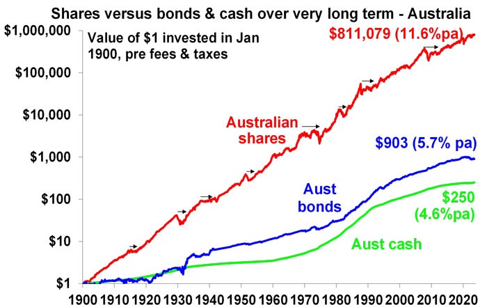 Secondly, the history of share markets (and other growth assets like property) in developed, well managed countries, with a firm commitment to the rule of law, has been one of the triumph of optimists. Sure, share markets go through bear markets and often lengthy periods of weakness – where pessimists get their time in the sun – but the long term trend has been up, underpinned by the desire of humans to find better ways of doing things resulting in a real growth in living standards. This is indicated in the next chart which tracks the value of $1 invested in Australian shares, bonds and cash since 1900 with dividends and interest reinvested along the way. Cash is safe and so fine if you are pessimistic but has low returns, and that $1 will have only grown to $250 today. Bonds are better, and that $1 will have grown to $903. Shares are volatile (and so have rough periods – see the arrows) but if you can look through that, they will grow your wealth and that $1 will have grown to $811,079.