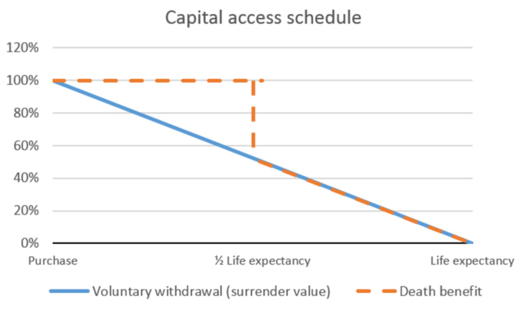 Voluntary commutations must follow a ‘straight line’ declining value, falling to nil at life expectancy. The death benefit can be up to 100% until the investor reaches half of their life expectancy, at which point it will follow the voluntary withdrawal value4.